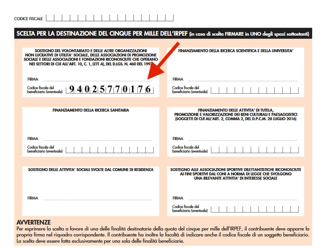 È molto semplice: nella tua dichiarazione dei redditi (modello 730, CU o Redditi PF), firma il riquadro “Sostegno degli enti del terzo settore” e scrivi il codice fiscale dell’associazione: 04225570989.